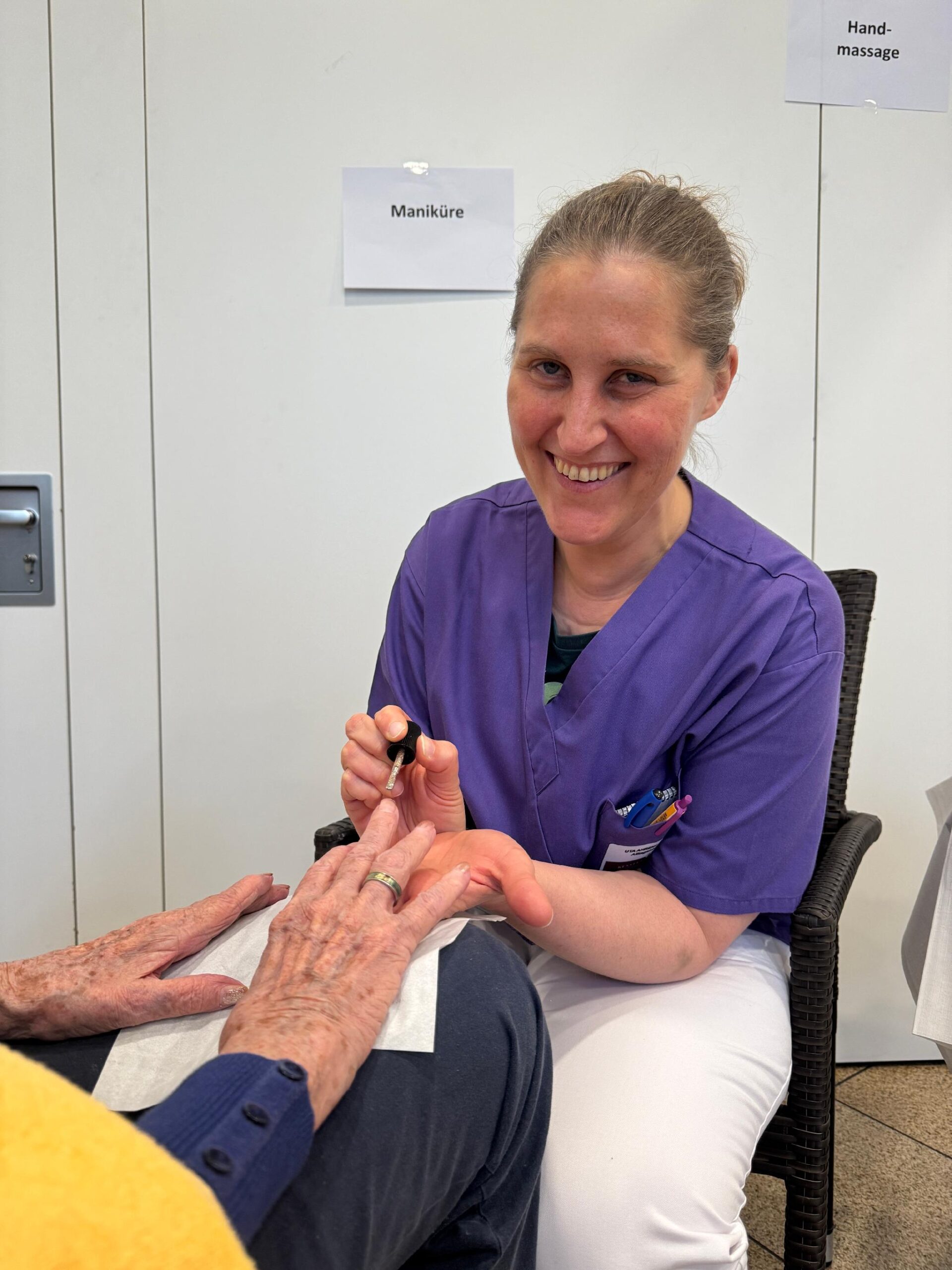 Beim Wellness-Tag verwandelte sich unser Foyer in eine kleine Oase des WohlgefĂŒhls â mit duftenden Ălen, sanften Handmassagen und entspannter Musik. Das Strahlen in den Gesichtern zeigte, wie viel WĂ€rme in solchen Gesten steckt. đ đż